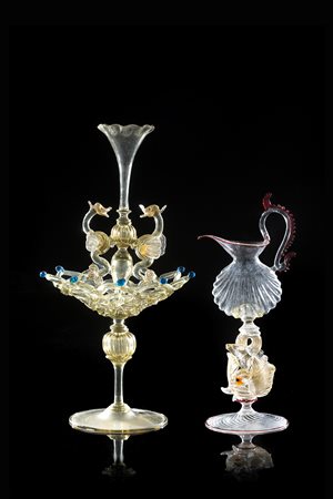 19th-century Murano manufacture. Lot comprising a glass ewer and a glass centrepiece (h. max cm 33) (defects and restorations)