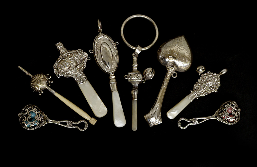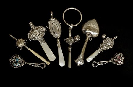 Otto sonagli in argento con prese in avorio o argento e madreperla. Epoche diverse