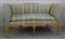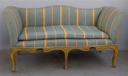 Divano a due posti con struttura in legno laccato e dipinto a motivi floreali, seduta e schienale imbottiti in tessuto a righe. Veneto, secolo XVIII (cm 172 x 85 x 75) (difetti)