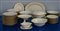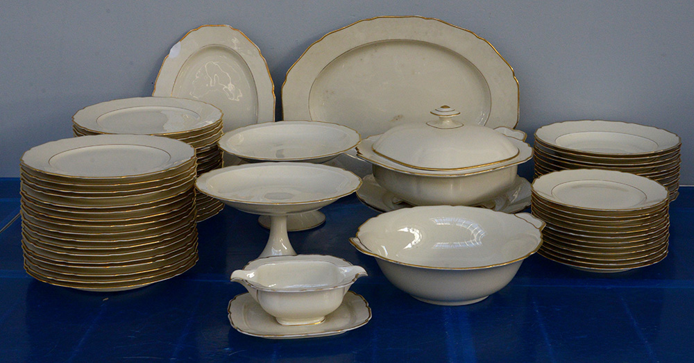 Parte di servizio di piatti color fondo crema con bordo dorato, composto da trentaquattro piatti pani, dodici piatti fondi, dodici piattini da dolce, due alzatine, quattro piatti da portata, una zuppiera, una salsiera e un'insalatiera (difetti)