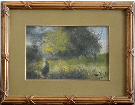 Firma indecifrata "Paesaggio con figura" tecnica mista su carta (cm 20x32) Firmato in basso a destra. In cornice