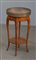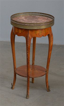Tavolino in legno intarsiato a motivi floreali, gambe mosse, piano in marmo entro ringhiera (cm h. cm 59 x d. 32) (difetti)