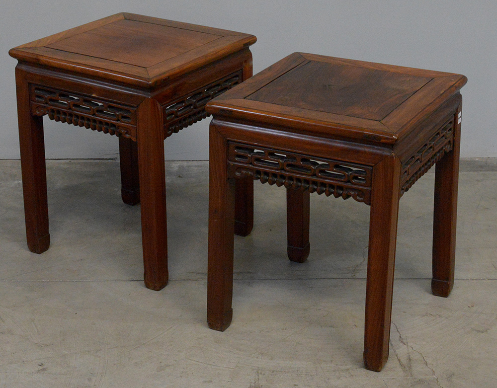 Coppia di tavolini quadrati in legno con decoro geometrico scolpito (cm...