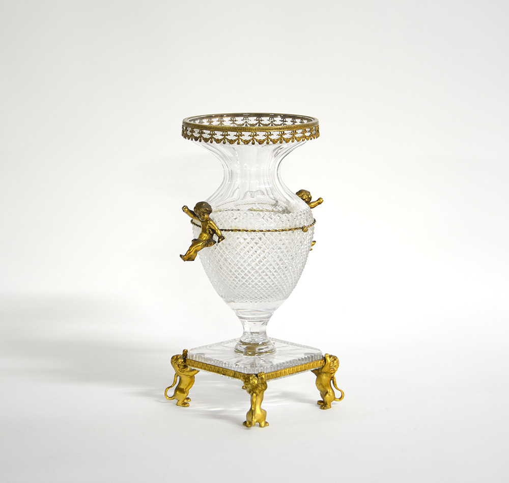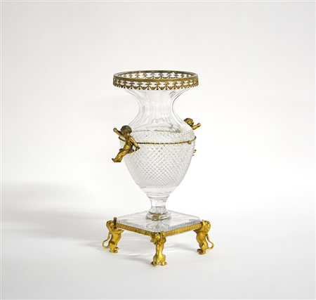 Vaso in cristallo molato decorato con leoni e amorini a tutto tondo in metallo dorato (h. cm 35) (difetti)