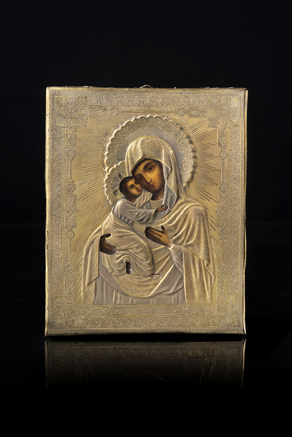 Icona raffigurante Madonna con bambino con riza in argento dorato, decorata a motivi vegetali. Russia, seconda metà del secolo XX (cm 18x14.5)