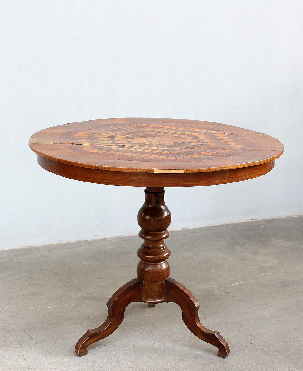 Tavolo tondo con sostegno a balaustro su base tripode, decorato con filettature ed intarsi geometrici. Secolo XIX (d. cm 90x h. 78) (difetti)