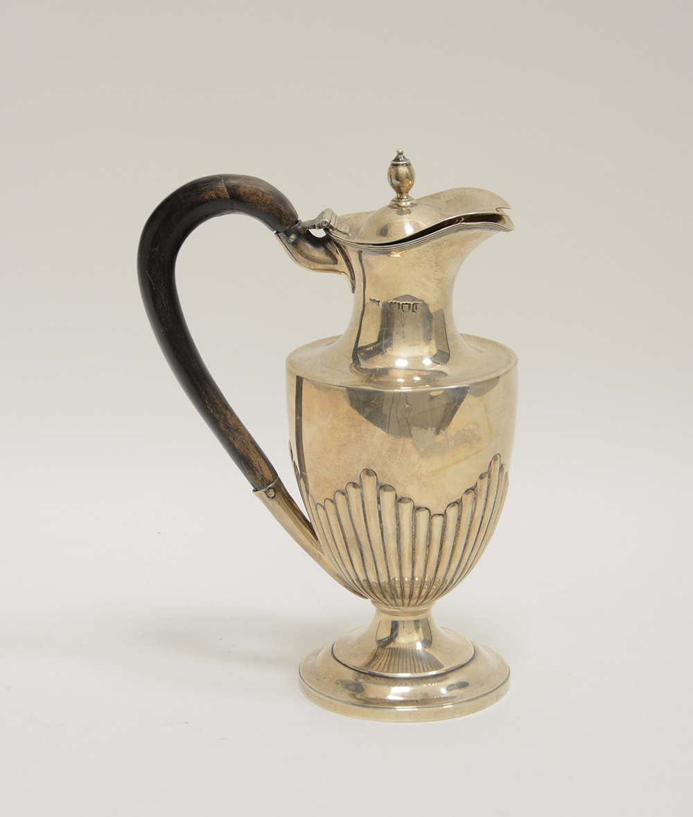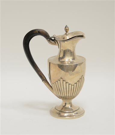 Caffettiera in argento con presa in legno. Punzoni inglesi (h. max cm 26) (gr. lordi 390) (difetti)