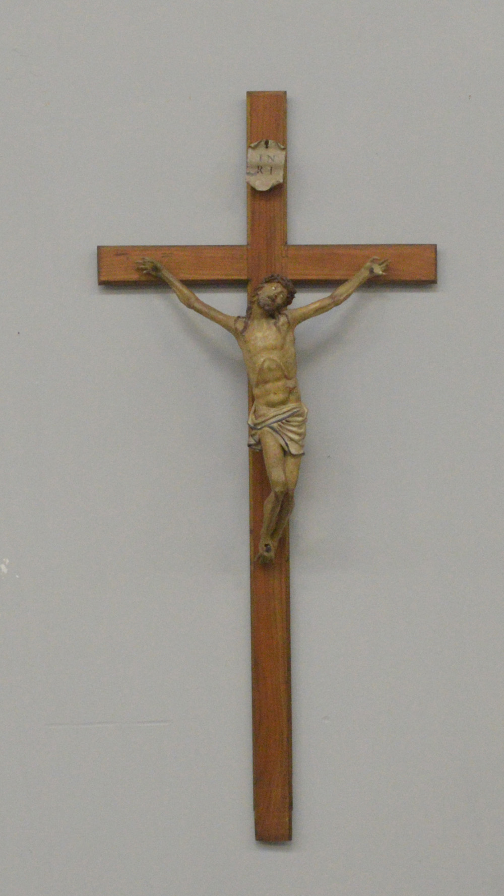 Arte del secolo XIX "Cristo crocifisso" scultura in papier mache laccato montato su croce (difetti)