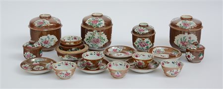 Gruppo di vari oggetti in porcellana Famiglia Rosa a fondo cafè-au-lait (h. max cm 14,5) (difetti e restauri)