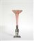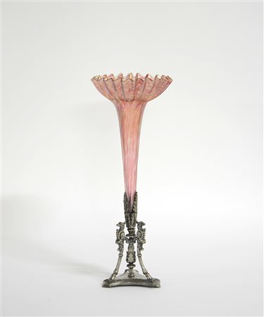 Vaso con calice in vetro soffiato a striature rosa e sostegno tripode in metallo argentato (h. cm 39)