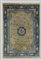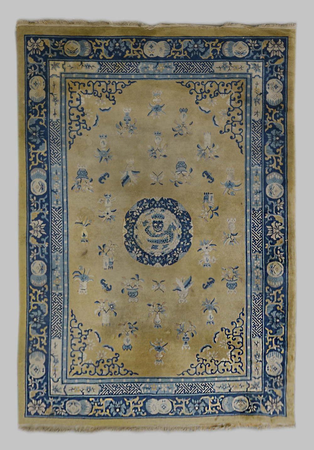 Tappeto cinese, Pechino fine secolo XIX. Decoro con medaglione tondo con drago nei toni dell azzurro, blu e bianco su fondo giallo (cm 298x221)(difetti)