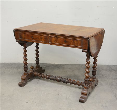 Tavolo ad alette con gambe a torciglione riunite da traversa e due cassetti nella fascia. Secolo XIX (cm 103x82x67) (difetti)