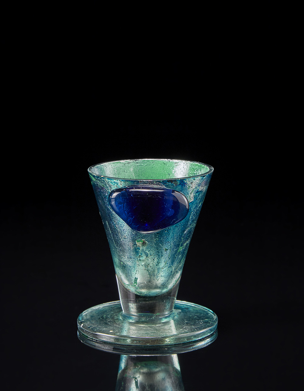 Vaso a calice decorato con applicazioni in pasta vitrea blu e smalti color argento, blu e verde. Sec. XX (h. cm 11) (difetti)
