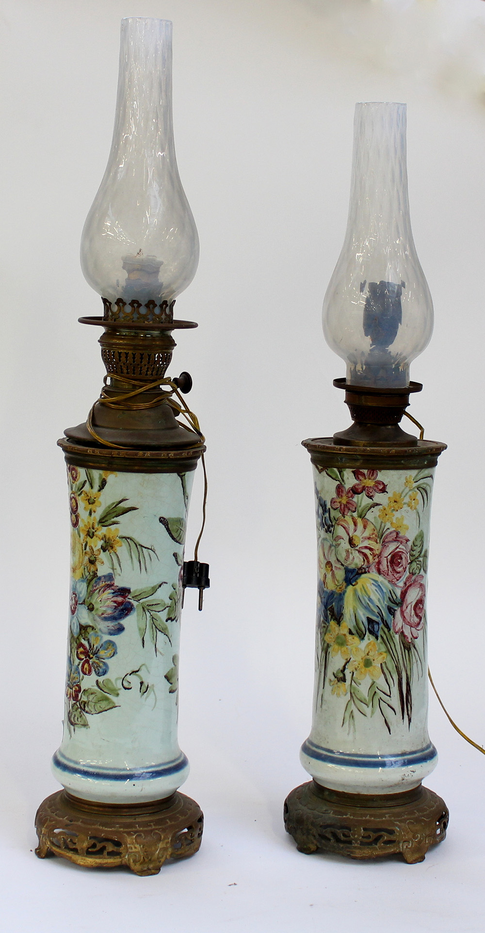 Due lampade ad olio con corpo decorato in policromia a fiori (h cm 50) (difetti, montate a luce elettrica in epoca posteriore)