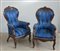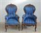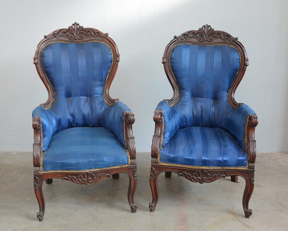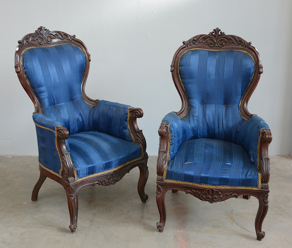 Gruppo di quattro poltrone in con schienali sagomati e braccioli terminanti a ricciolo. Secolo XIX (difetti)