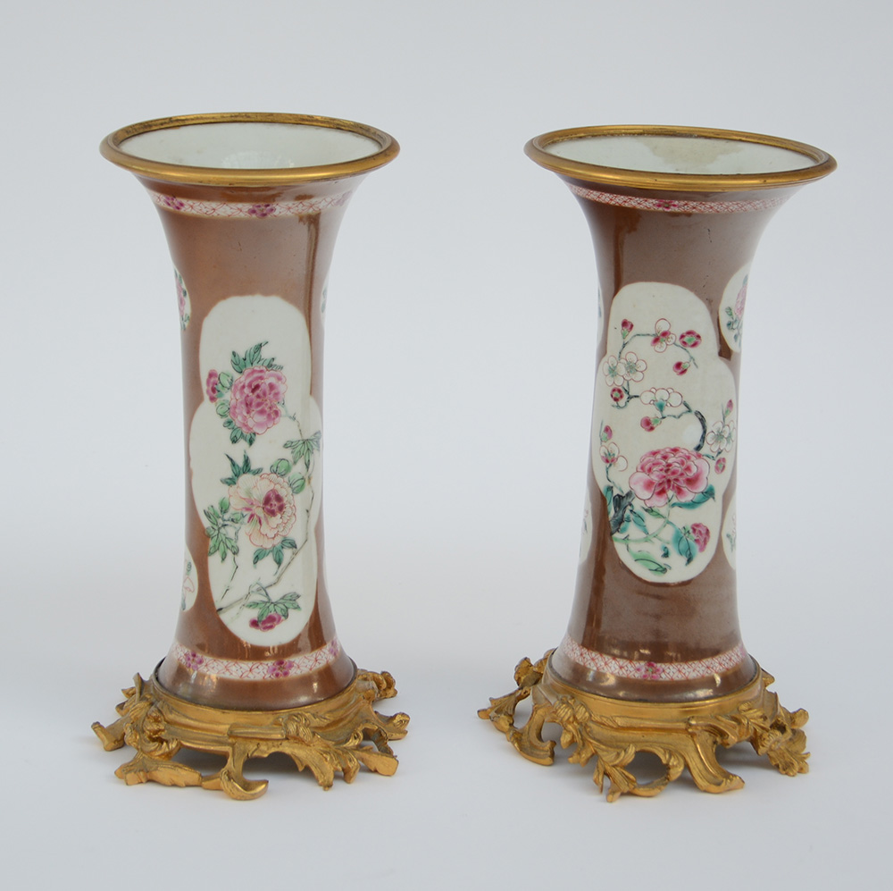 Due vasi in porcellana montati in bronzo, stile "Batavia", sec. XVIII (h. cm 26,3) (restauri)