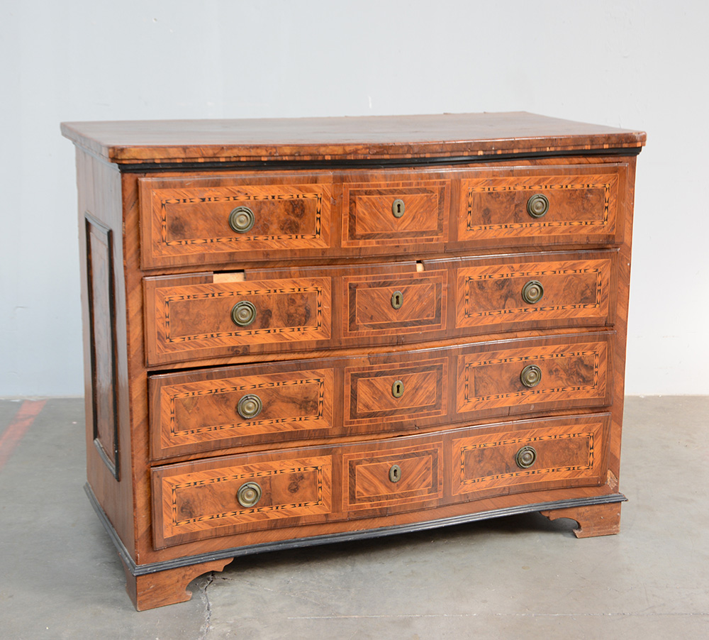 Cassettone a quattro cassetti filettati e decorati a intarsi geometrici, fronte mosso, cornici ebanizzate e piedi a mensola. Secolo XVIII (cm 132x105x64) (difetti e restauri)