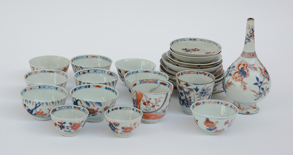 Gruppo di ventiquattro pezzi in porcellana Imari composto da coppette, piattini e un vasetto