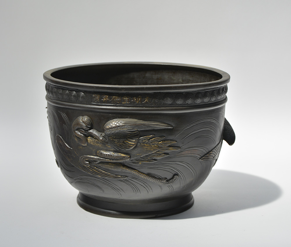 Incensiere in bronzo decorato con gru in volo, marchio apocrifo Xuande inciso...