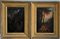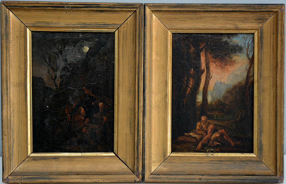 Scuola dell'inizio del secolo XIX "Paesaggi con figure" coppia di dipinti ad olio su tela (cm 21x14) in cornici dorate (difetti)