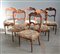 Gruppo di sei sedie in noce con schienali intagliati a valva di conchiglia....