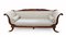 Grande divano con struttura in legno intagliato, braccioli mossi e piedini a zampa ferina rivestito con tessuto a righe color champagne. Secolo XIX (cm 253x93x88) (difetti, mancanze e restauri)
