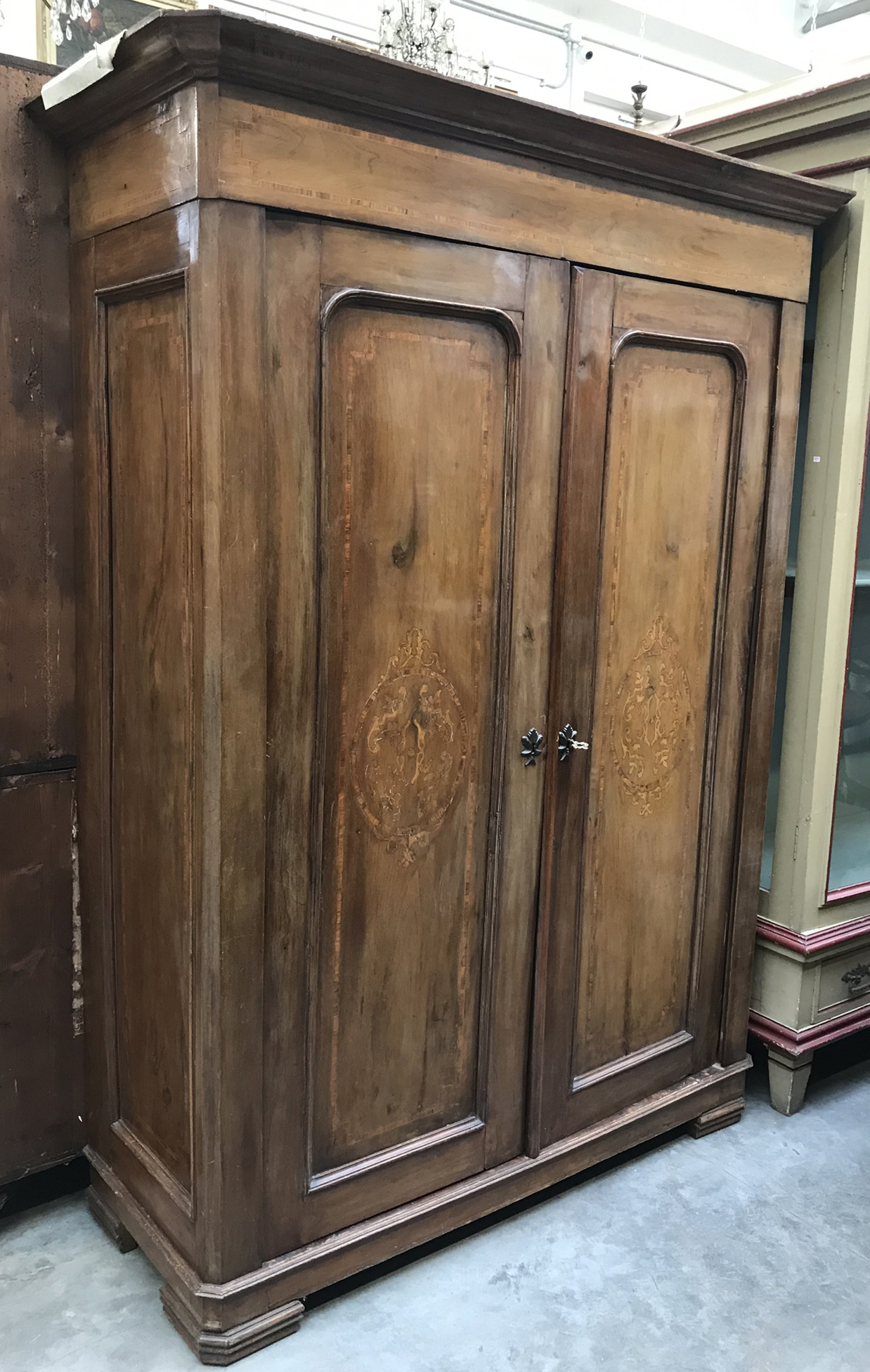 Armadio in noce a due battenti con specchiature incorniciate e decorate da piccoli intarsi. Fine secolo XIX (cm 142x192x56) (difetti)