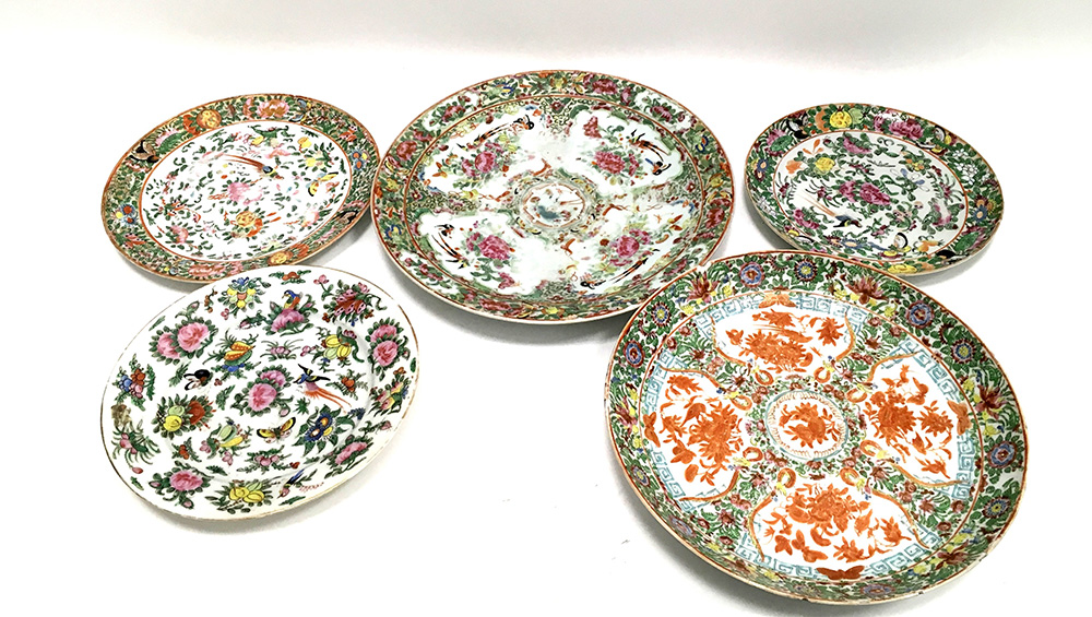 Gruppo di cinque piatti in porcellana Famiglia Rosa cantonese e in policromia, soggetti e misure diverse (difetti) Cina, sec. XIX