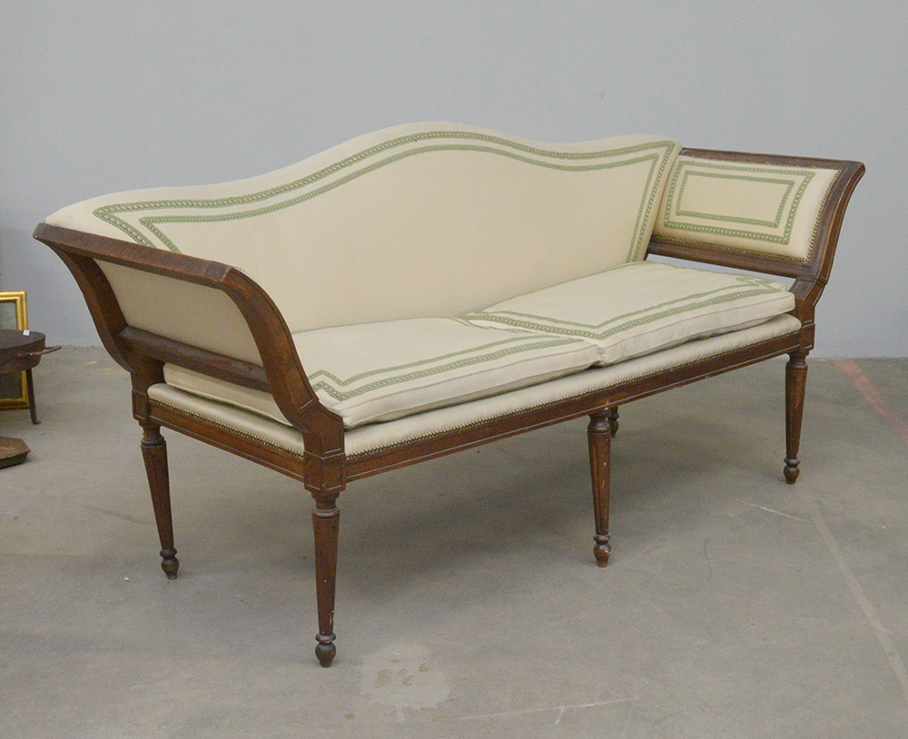 Divano a tre posti in noce con braccioli e schienale mossi, rivestimento con ricami in tessuto beige. Secolo XVIII (l cm 210) (difetti e restauri)