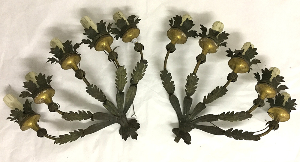 Coppia di appliques a cinque fiamme in metallo e legno dorato con decoro fogliaceo. Tracce di policromia. Secolo XIX