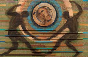 Bruno Ceccobelli Monte Castello Vibio (Pg) 1952 Alba del giudizio Tecnica mista e collage su tavola, cm. 110x170 Sigla e titolo al verso: BC / L' alba del giudizio. Foto autenticata dall'artista, Todi, 12/12/05, con n. ES077XU.
