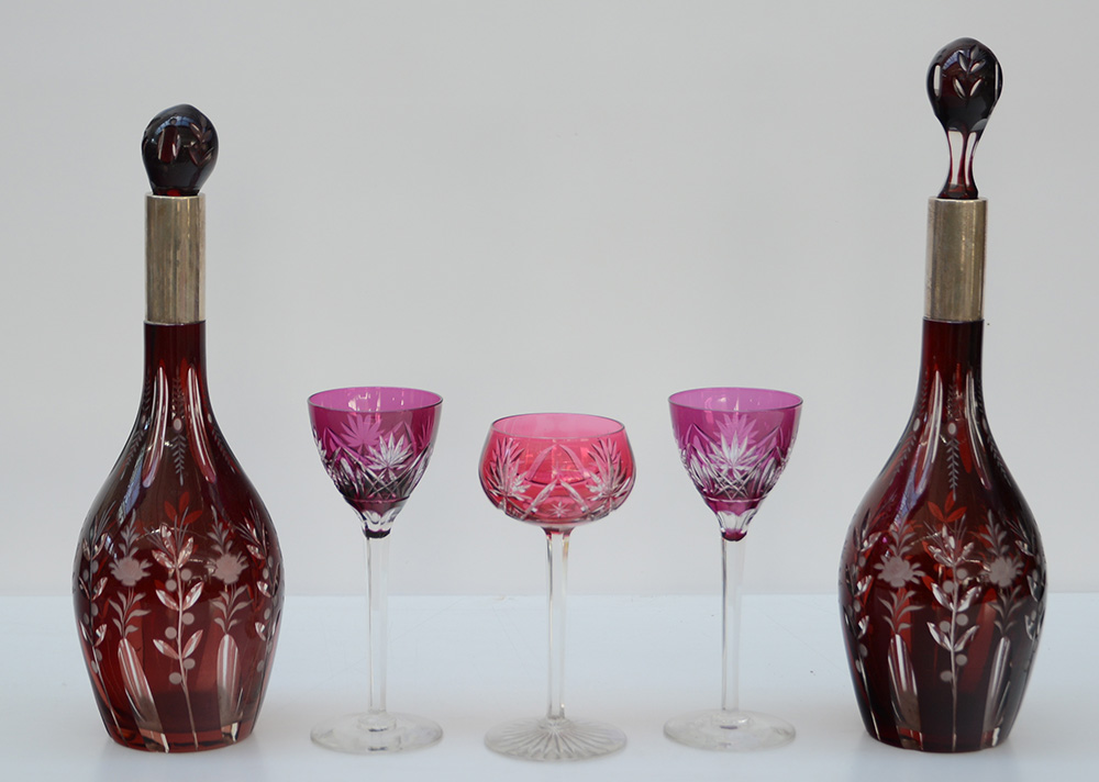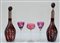 Manifattura di BoemiaLotto composto da tre calici e due bottiglie con tappi...