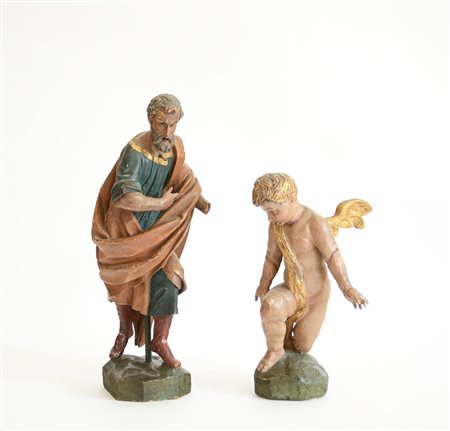 Lotto composto da due sculture del secolo XIX in legno laccato in policromia e doratura raffigurante putto alato e figura maschile. Secolo XIX (h. massima cm 45) (difetti e mancanze)