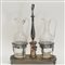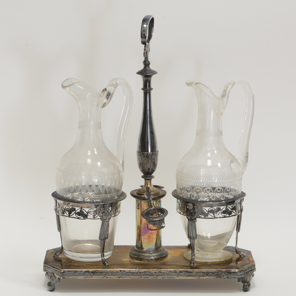 Set olio e aceto in argento con montanti decorati a figure alate. Base ottagonale cesellata a foglie e grappoli d'uva. Punzone Milano, secolo XIX (g 630 ca.) (difetti e restauri)