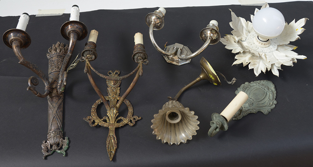 Lotto composto da due appliques a due fiamme in metallo decorato a faretra e festoni, una a due fiamme in metallo cromato, due a una fiamma in metallo e vetro ed una plafoniera in metallo laccato (difetti)