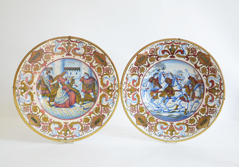 Manifattura del centro-Italia, inizio del secolo XX. Coppia di piatti in stile rinascimentale con decori classici a lustro (diam. cm 42)