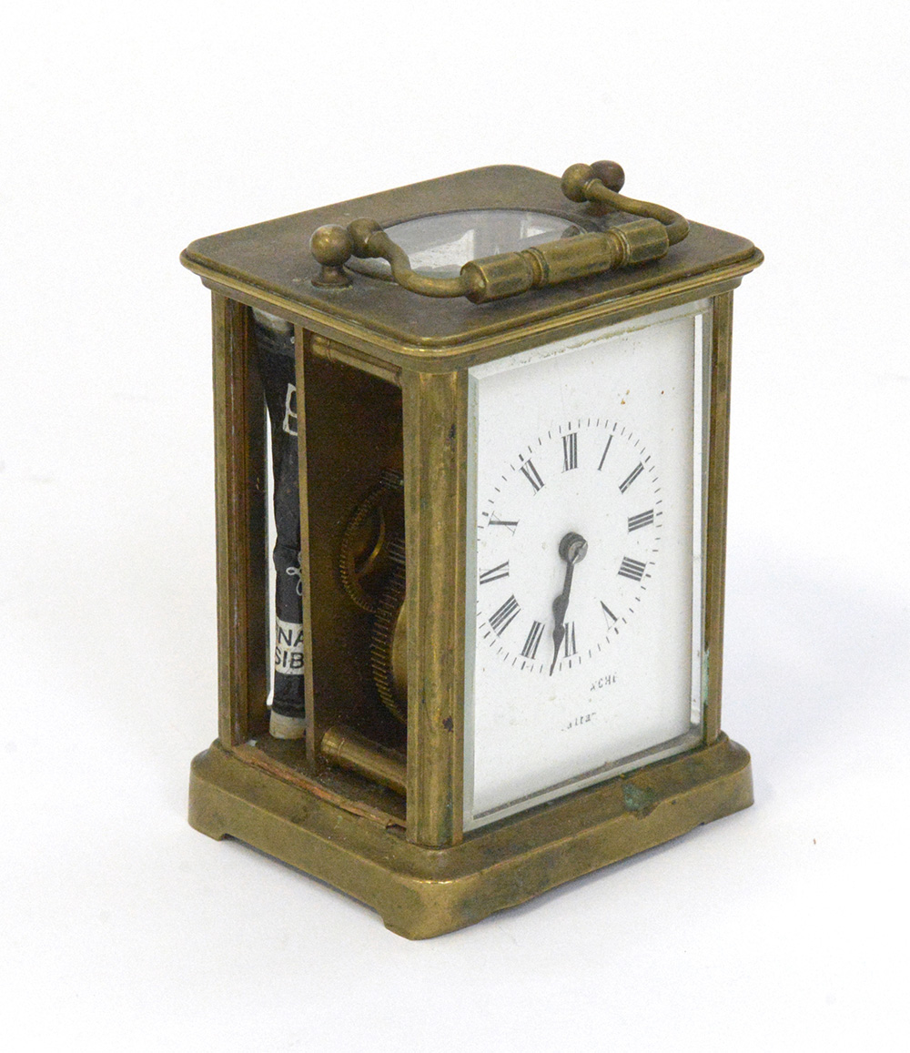 Officier in ottone con quadrante a cifre romane, movimento con carica manuale solo tempo , scappamento a cilindro (con maniglia aperta h cm 14 circa) (difetti e mancanze)