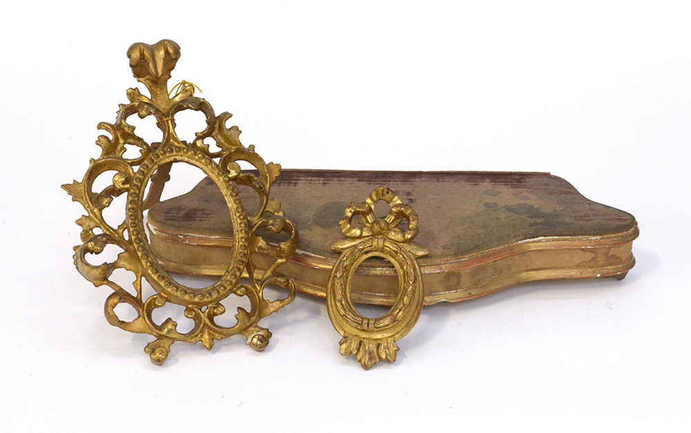 Lotto composto da due cornicette e una base in legno dorato. Secolo XIX...