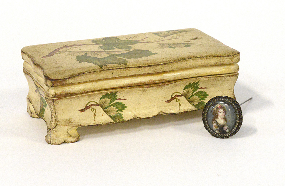 Ferma foulard decorato da miniatura di gentildonna in smalti rifinito con pietre incolore, in scatola in legno laccato a foglie di vite (difetti)