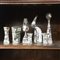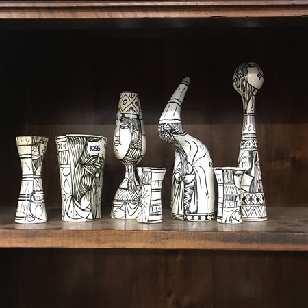 Lotto di sette oggetti in ceramica smaltata in bianco e decorato con disegni geometrici in bruno. Padova, anni '50. Marcato sotto la base. (gravi difetti)