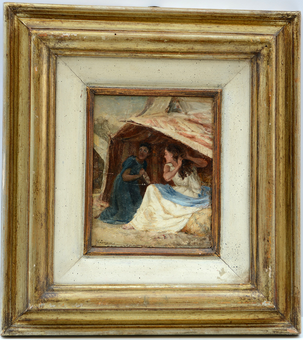 "Nella tenda" 1876, olio su cartone (cm 24x19) Firmato e datato in basso a sinistra (difetti e restauri) In cornice