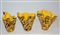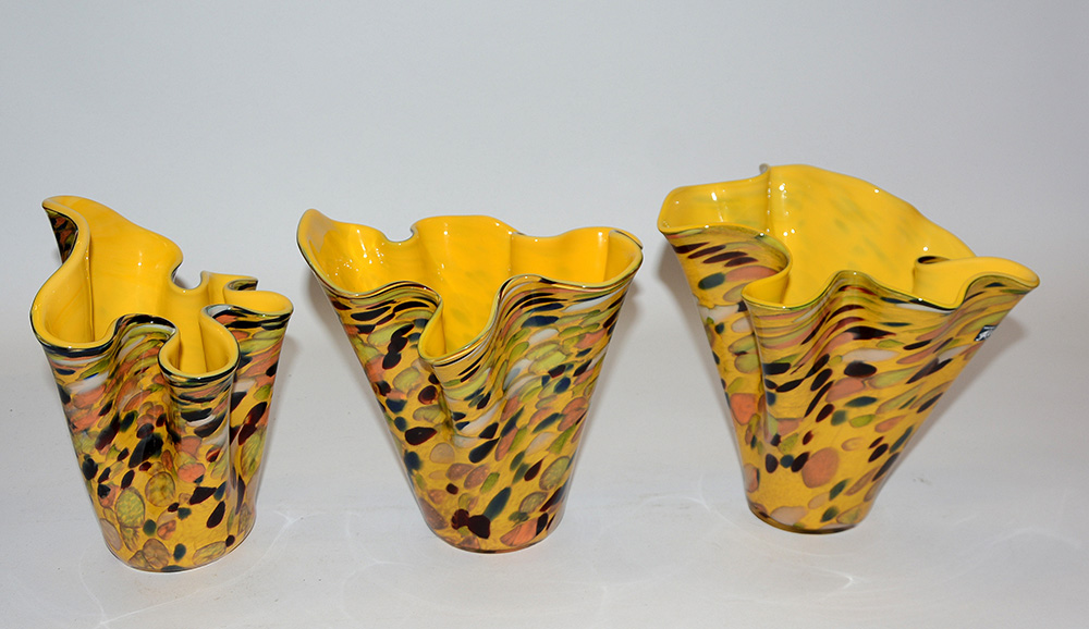 Lotto composto da tre vasi a fazzoletto in vetro policromo, interno in vetro giallo (h max cm 22)