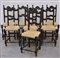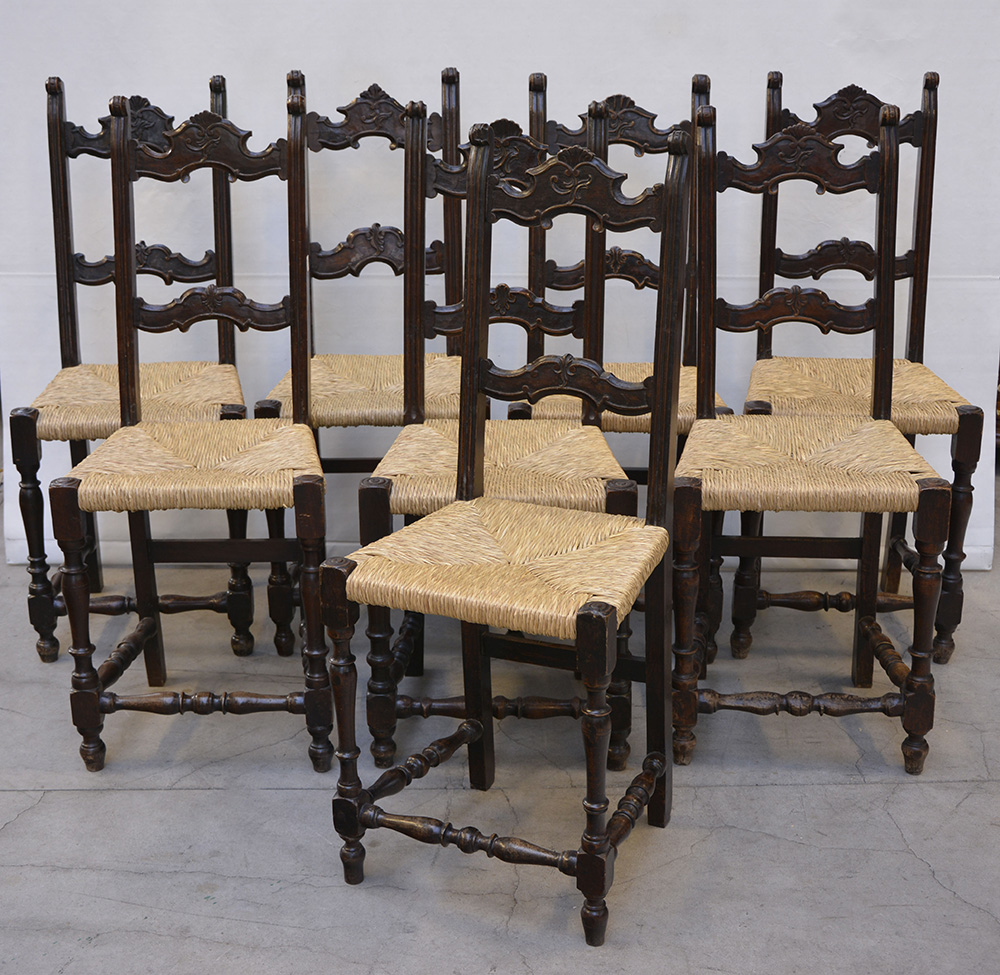 Gruppo di otto sedie in legno con schienale a giorno riunito da traverse sagomate. Gambe anteriori a raccordi torniti e posteriori lisce diritte. Sedile impagliato. (difetti)