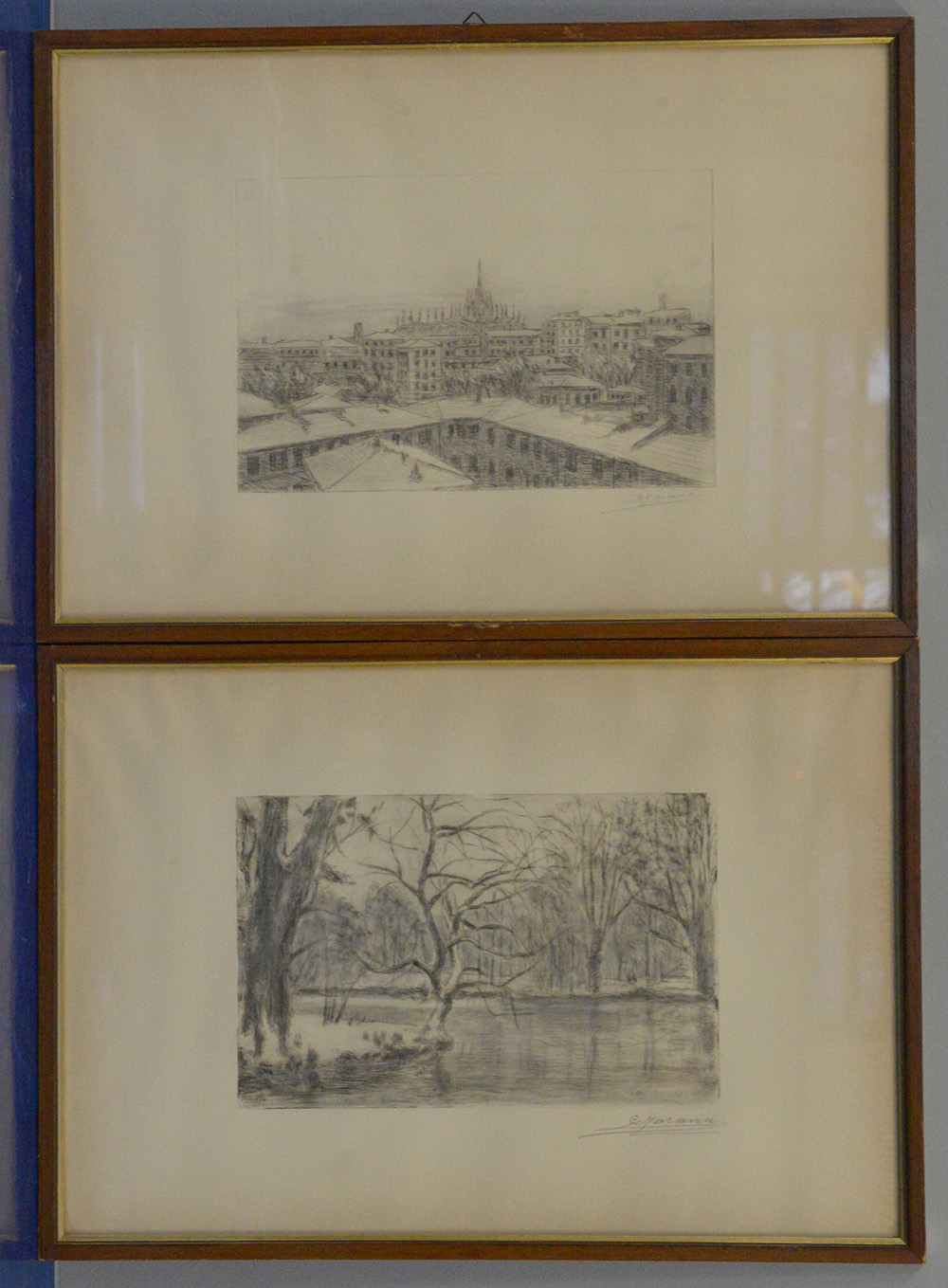 Coppia di acqueforti raffiguranti scorcio di Milano e laghetto (cm 32x48)...