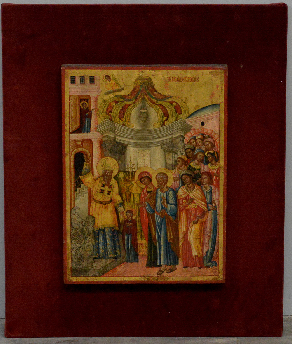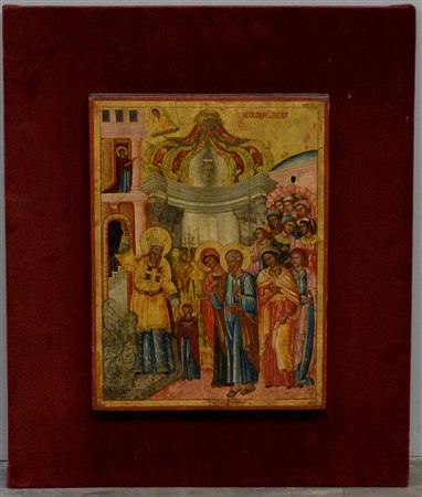 Icona raffigurante la "Presentazione della Vergine al Tempio" montata su pannello di velluto rosso. (cm 44x33) (difetti e restauri)