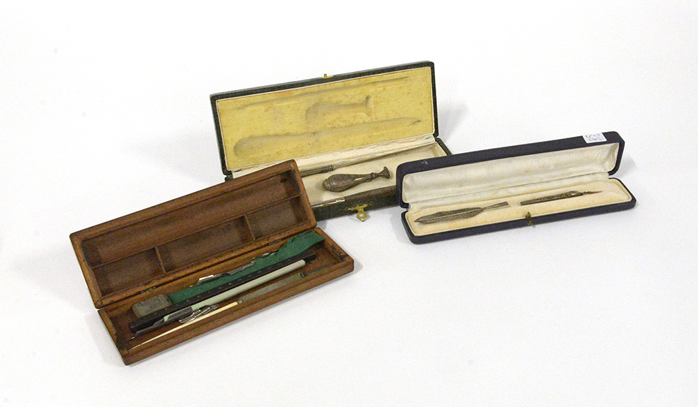 Lotto composto da tre set da scrivania di cui uno in filigrana d'argento, in custodie (difetti)