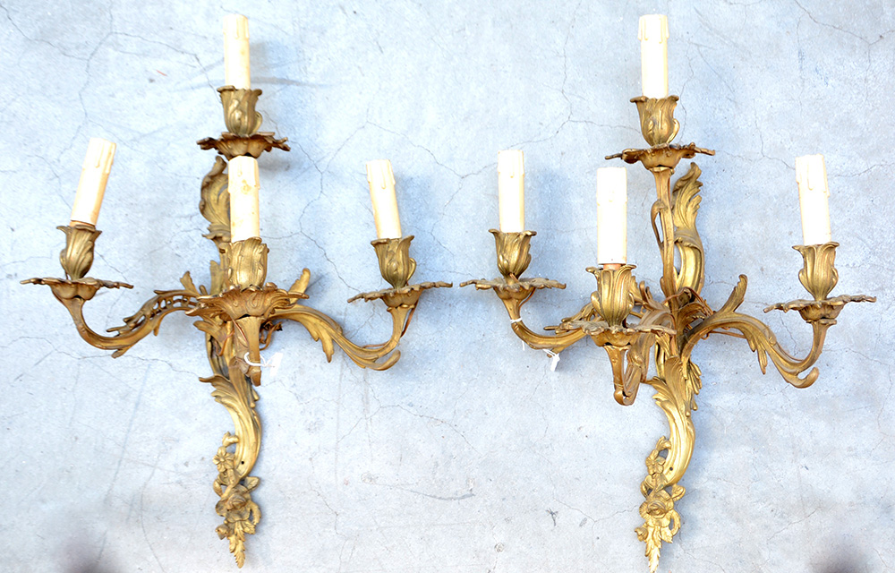 Coppia di appliques in metallo dorato a quattro luci di forma naturalistica (h. cm 45)