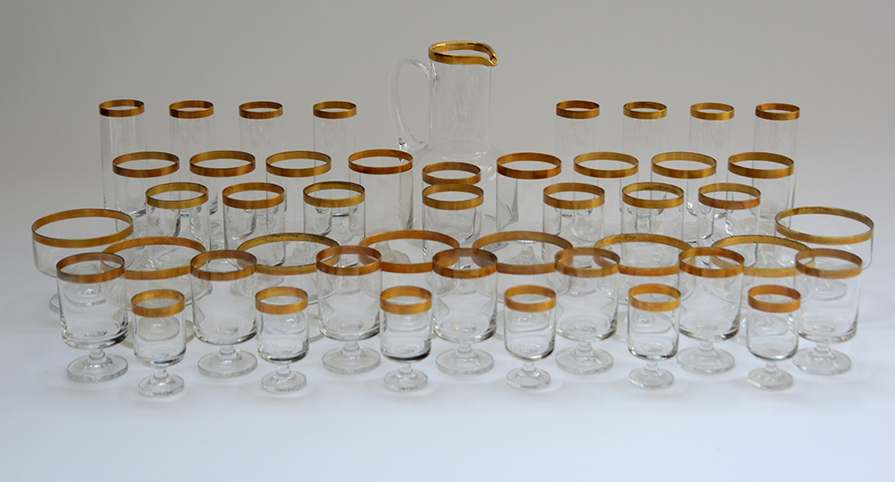 Manifattura del secolo XX. Servizio da tavola per otto persone in vetro incolore con bordi dorati, composto da una caraffa, bicchieri da acqua, bicchieri da vino bianco, bicchieri da vino rosso, flutes, coppe da macedonia, bicchieri da amaro (difetti)