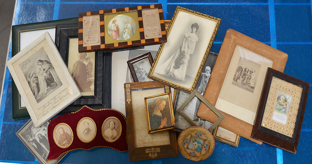 Cartone contenente numerose cornici portafoto di diverse epoche e materiali (difetti)