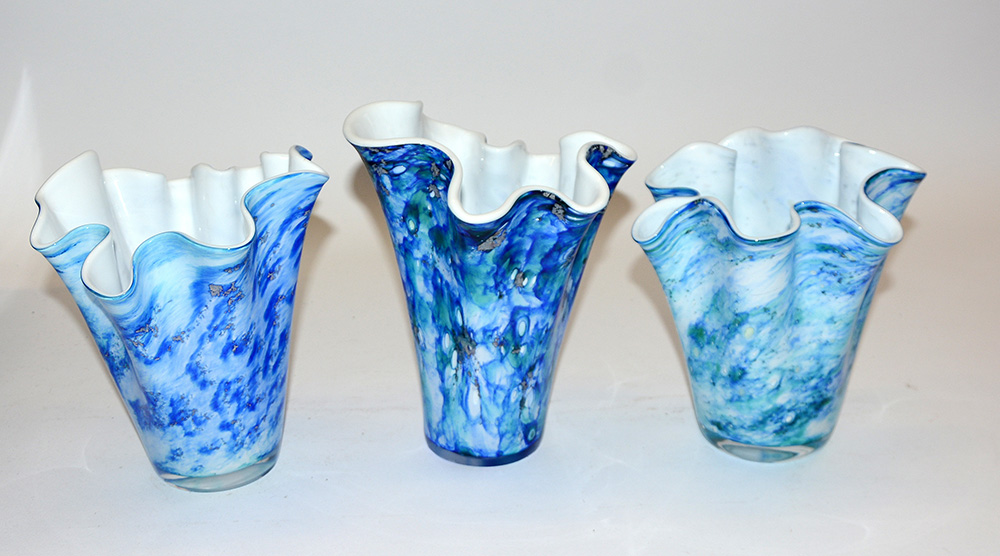 Lotto composto da tre vasi a fazzoletto in vetro a decoro marmorizzato nei toni del blu (h max cm 22)